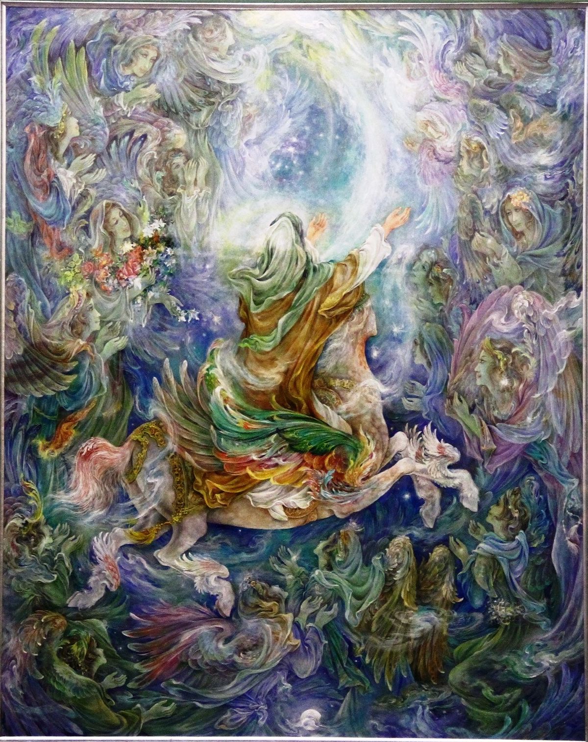 این اثر در ابعاد ۱۰۱ در ۸۱.۵ سانتیمتر، نقاشی شده است. در آن در کنار تصویر پیامبر(ص)، فرشتگان در حال دعا و نیایش هستند. به عقیده فرشچیان، در بارگاه الهی، جنسیت معنا ندارد. به همین دلیل در این تابلو، هیچ یک از فرشتگان جنسیت ندارند. در این تابلو نیرویی دیده میشود که پیامبر را به سمت خدا میکشاند و هر چه بالاتر میرویم، فرشتگان در ذات الوهیت خداوند، محو میشوند.[۴۴]